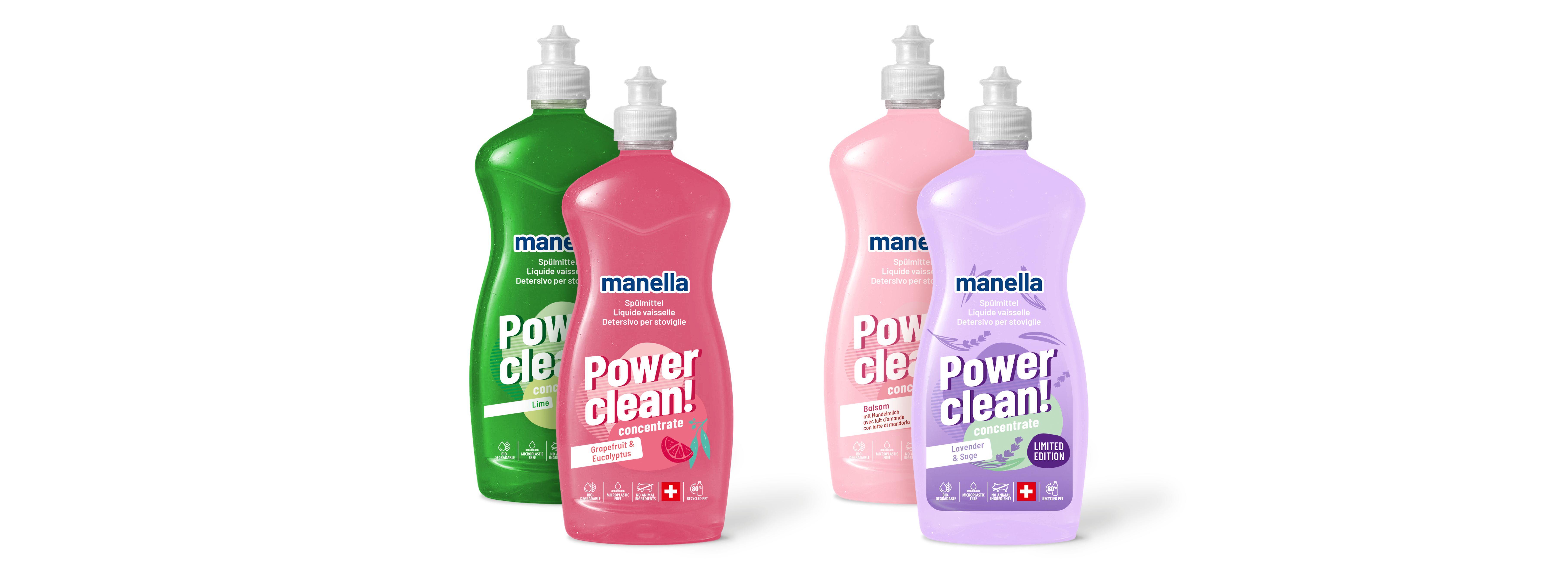 Für die bekannte Marke Manella wurden mehrere frische Verpackungsdesigns entwickelt. Während das Logo nur dezent angepasst wurde, erhielt die gesamte Linie einen neuen visuellen Auftritt. Die Gestaltungsvorschläge bringen Frische, Putzkraft und die jeweiligen Düfte klar zur Geltung – mit leichten Farben, reduzierten grafischen Elementen und einem cleanen Look, der Sauberkeit sichtbar und spürbar macht.